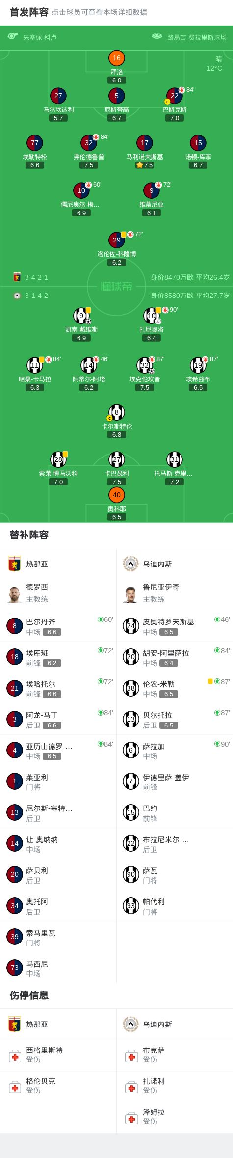 下半場補時第6分鐘,烏迪內斯球員凱南-戴維斯打入一球。
